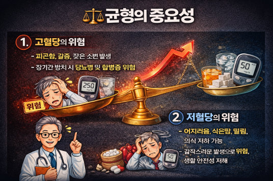 혈당이 너무 낮으면 어지러움, 식은땀, 떨림, 심하면 의식 저하까지 생길 수 있습니다. 특히 저혈당은 갑작스럽게 발생할 수 있어 위험합니다. 균형 잡힌 혈당은 단순히 병을 예방하는 것이 아니라, 안전한 생활을 가능하게 합니다. 혈당은 높아도, 낮아도 문제이므로 항상 균형을 유지하는 것이 핵심입니다.